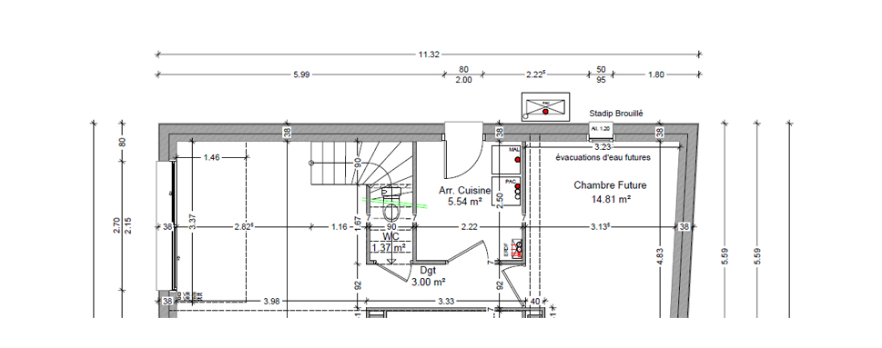La mise au net. Après le relevé de côtes, Le projet commence, et il commence par dessiner à l’échelle le bâti existant que l’on a été relevé. Il peut aussi s’agir de reprendre des plans anciens et papier. Ce plans est la base de travail pour la suite. il est important qu’il soit carré et et qu’il contienne toutes les informations importantes.